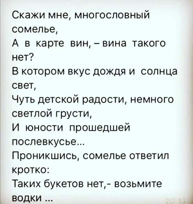 Проникшись, сомелье ответил очень тонко: таких букетов нет - возьмите самогонки.